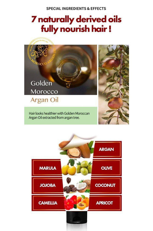 - حاوی 7 نوع روغن طبیعی آرگان، زیتون، نارگیل، جوجوبا، زردآلو، مارولا و کاملیا برای تغذیه مو