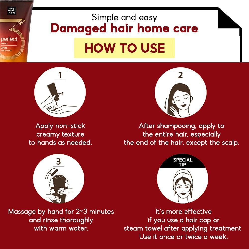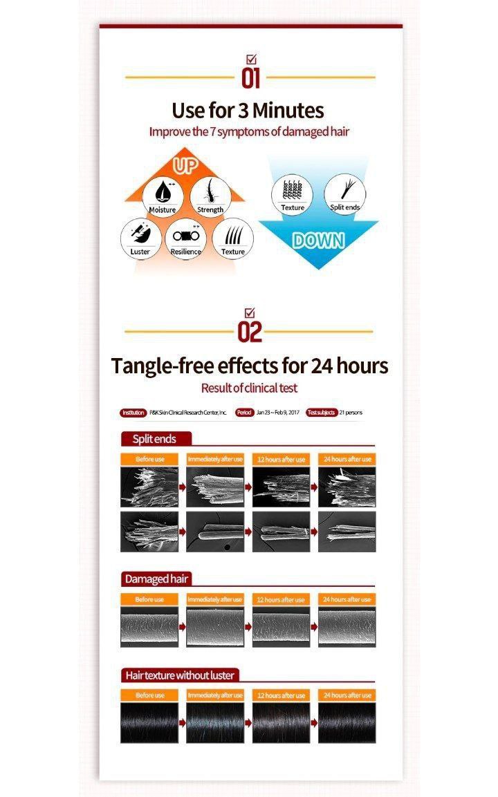 به 3 دقیقه زمان نیاز وارد، اما با 7 نشانه موهای آسیب دیده (دوشاخه + عدم رطوبت + ضعف + گره خوردن + موهای زبر + موهای کم رنگ + کشسانی کم) مقابله می کند.